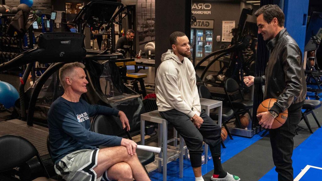 Federer cumprimentou o treinador Steve Kerr e todas as estrelas dos Warrior, posou para fotografias e ainda arriscou quatro lances, com acerto de 100%. “Tive sorte”, brincou o multicampeão.